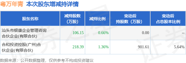 证券之星消息高忆配资,12月5日粤万年青发布公告《粤万年青:关于控股股东、实际控制人之一致行动人减持股份变动触及1%暨减持计划实施完毕的公告》,其股东汕头市银康企业管理咨询合伙企业(有限合伙)、合和投资控股(广州)合伙企业(有限合伙)于2025年12月3日至2025年12月4日间合计减持324.54万股,占公司目前总股本的2.0284%,变动期间该股股价上涨14.99%,截止12月4日收盘报27.92元。